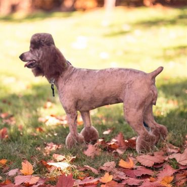 A red poodle with a stylish cut stands on grass, tongue slightly out.